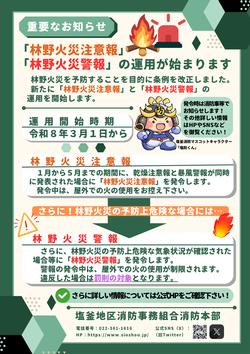 全国各地で林野火災が多発しています。林野火災を未然に防ぐため、塩釜地区消防事務組合で条例を改正し、新に「林野火災注意報」と「林野火災警報」の運用を開始します。
