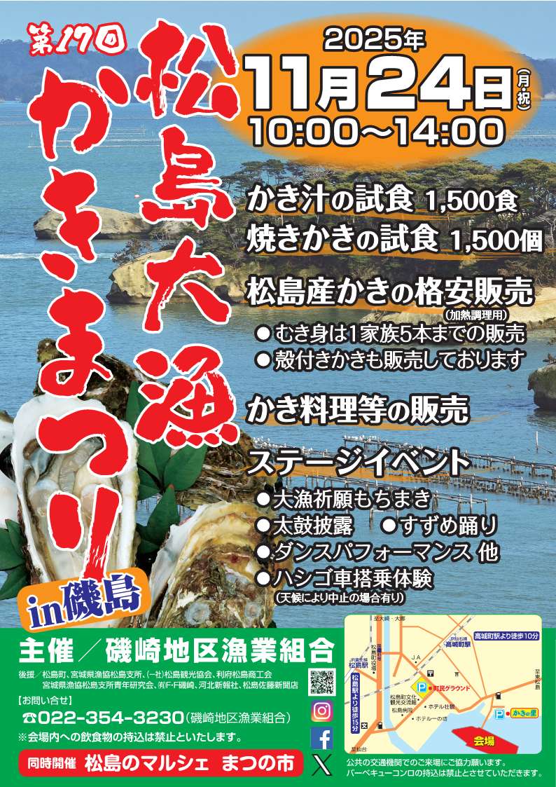 令和7年11月24日(月曜・祝日)、磯島(松島町磯崎字磯島)を会場に、『第17回松島大漁かきまつりin磯島』が開催されます。
