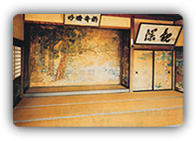 藩主等の賓客の間であり床の間、襖、障子腰板に金箔を張り付け、極彩色で画かれた桧と槙・笹竹等を中心に林木花卉と渓流の図は、構図法・彩色方から伊達家お抱の狩野派系統の絵師の遺品と見られている。 床の間の「雨奇晴好」の額は5代藩主吉村公の筆で宋の詩人蘇軾の詩から採った句である。 この亭を「観瀾亭」と命じたのは吉村公で廊下の額は江戸中期の書家佐々木玄龍の筆で次の間との欄間にかけてある「観瀾」の二文字は7代藩主重村公による。 |