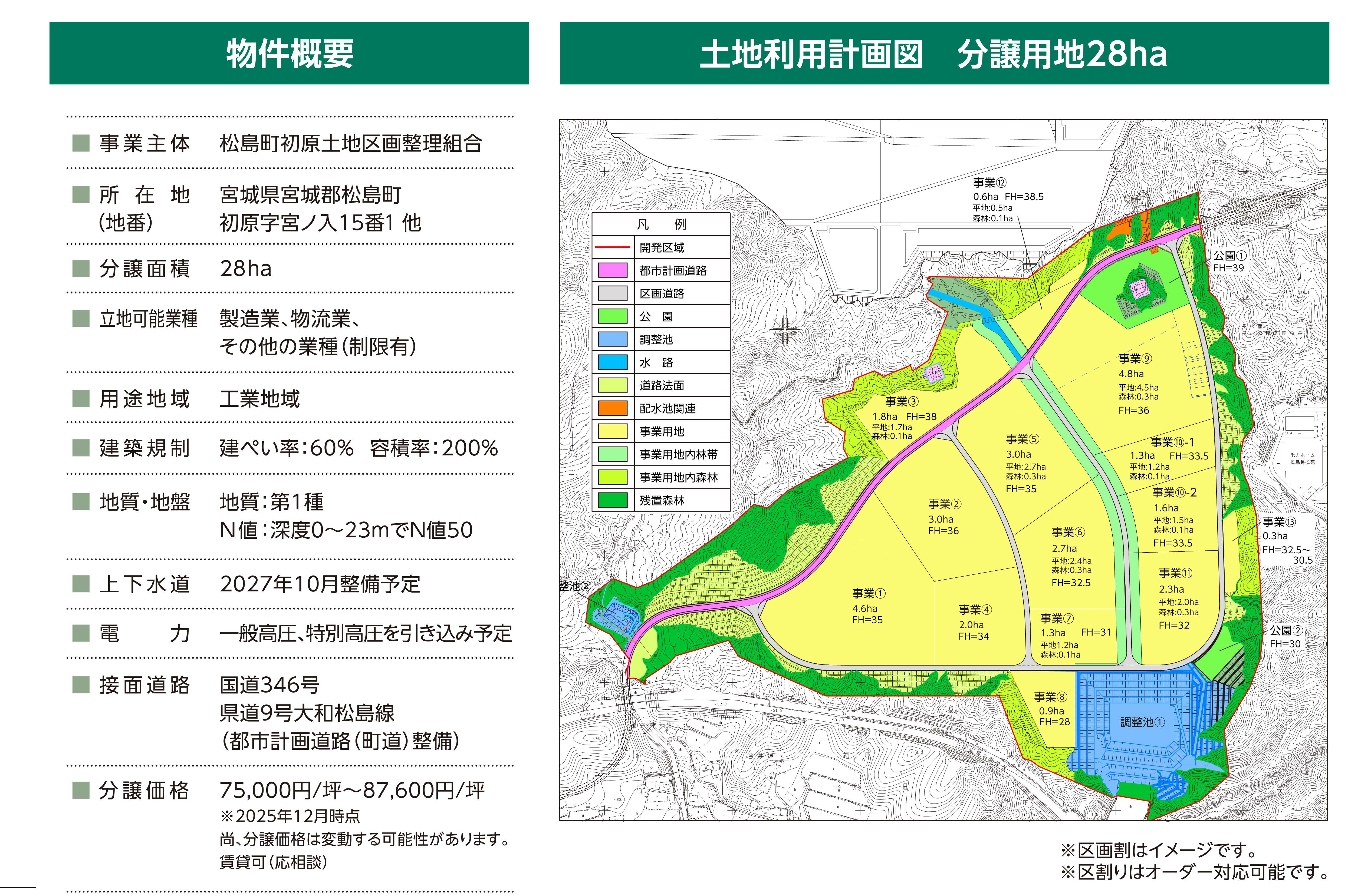 『松島イノベーションヒルズ 』の提供用地は約28ヘクタールの広さで、企業の皆様の立地計画に合わせたオーダーメイドによる用地の取得が可能です。